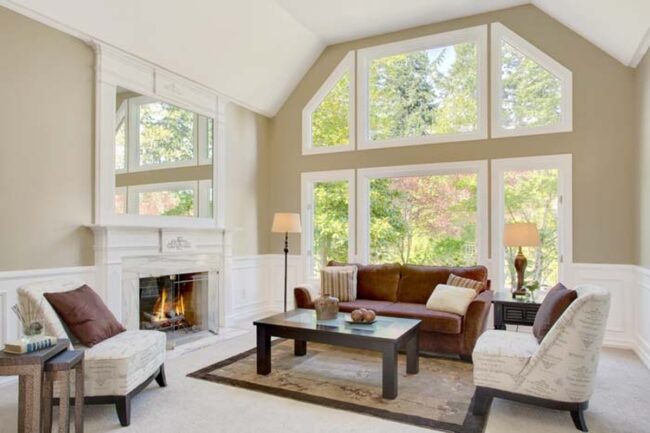 Subtle white accents from fixtures like fireplaces enhance the room's elegant design scheme with understated grace.
