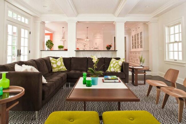 Dark brown sofas offer a perfect canvas for lime green accents that energize any living space.