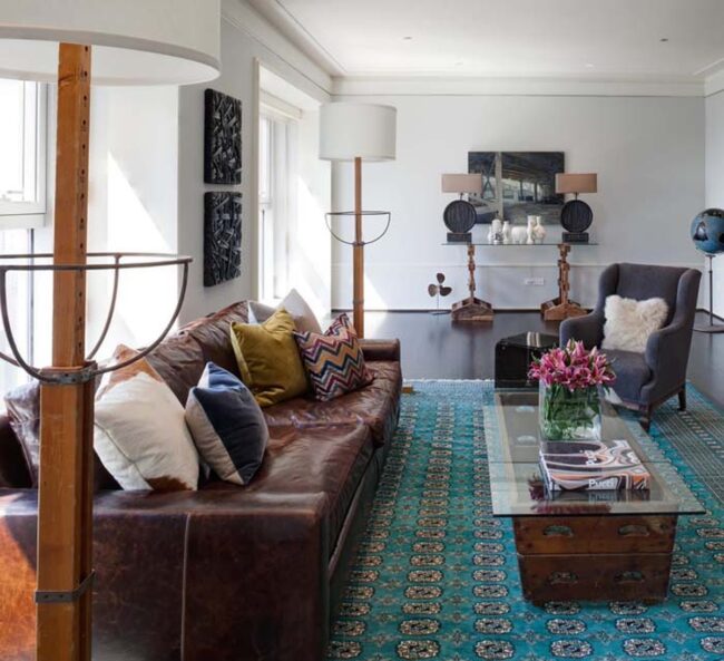 Leather sofas radiate timeless elegance when paired with carefully selected decor elements like a turquoise area rug that introduces dynamic visual depth.