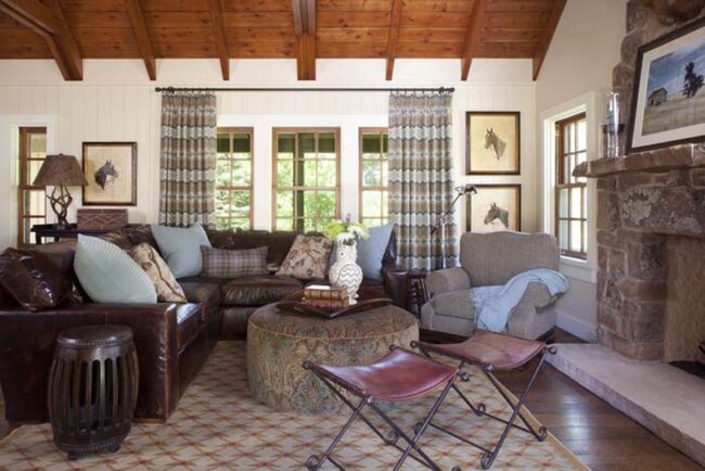 Leather folding chairs strategically placed around the main seating area enhance the room's cohesive charm and functionality.