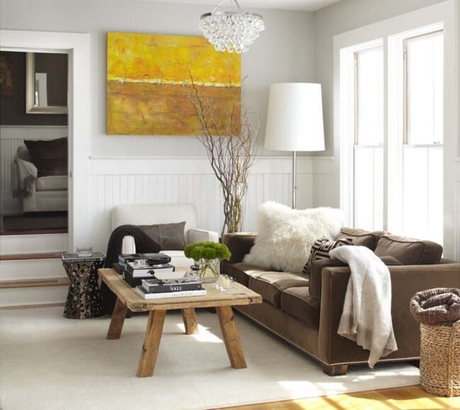 Bold golden artwork instantly transforms a dark brown sofa's presence, commanding attention with dramatic flair.