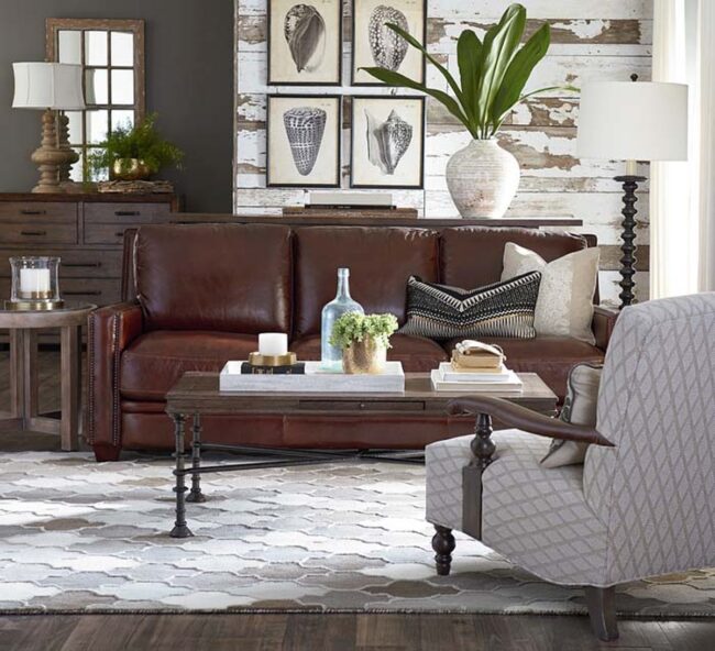 Warm wood tones in side tables or picture frames complement the rich brown leather, connecting different design elements seamlessly.