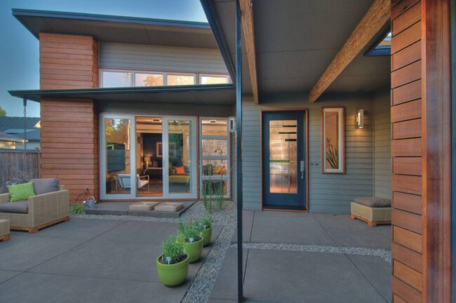 Concrete pavers paired with gravel create an elegant outdoor sanctuary that maximizes space and aesthetic appeal.