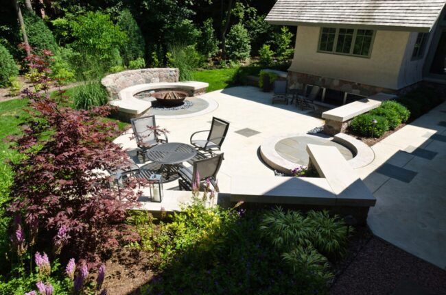 Concrete patios serve as perfect foundations for these intimate gathering spots, blending indoor comfort with natural surroundings.
