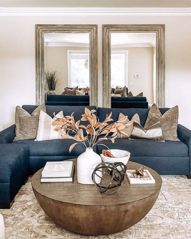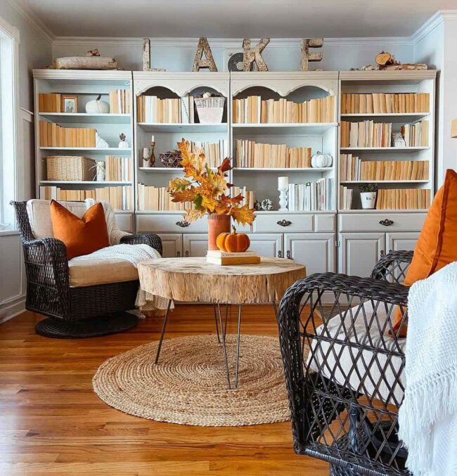Rustic log coffee tables steal the spotlight in this autumn-inspired room, showcasing an orange vase bursting with dancing oak leaves.