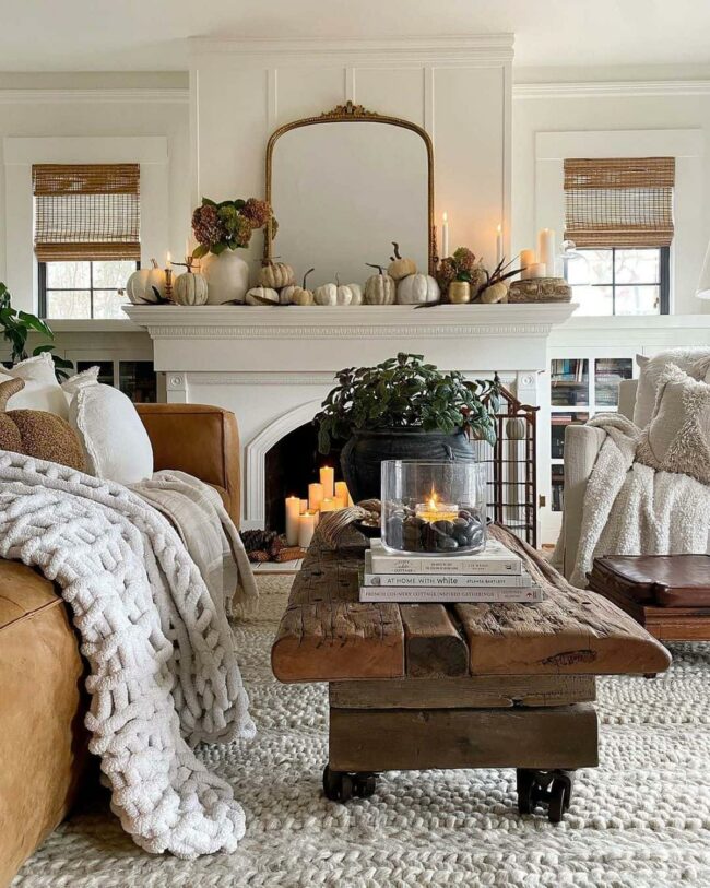 Soft fabric pumpkins add a playful touch to the cozy scene, creating an inviting seasonal sanctuary.