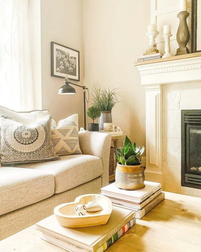 Rustic brass candlesticks gleam atop hardcover books, casting a warm glow across this greige living room's inviting atmosphere.