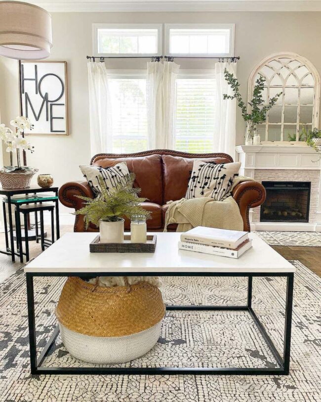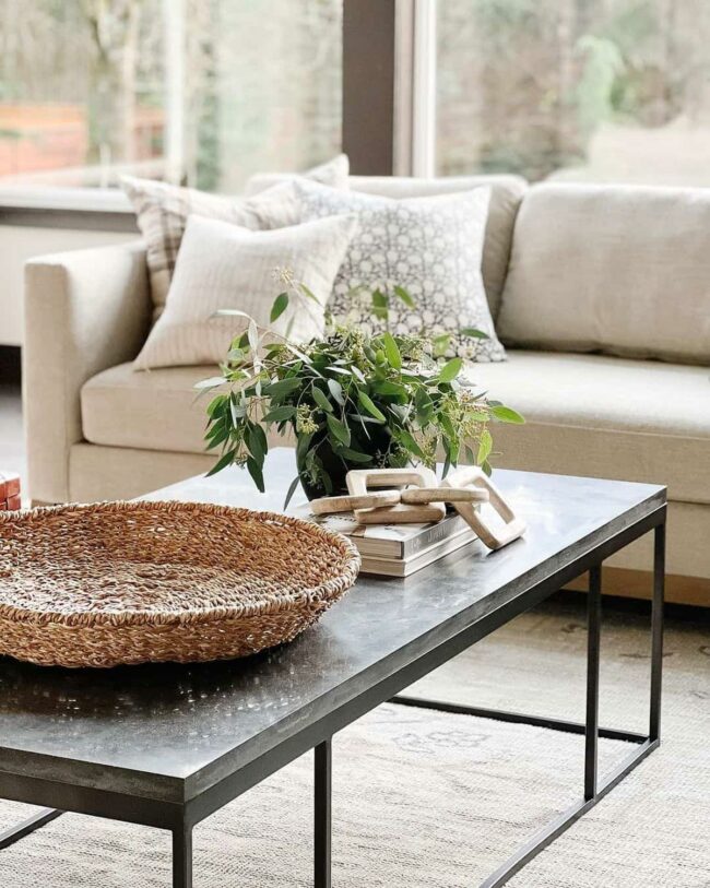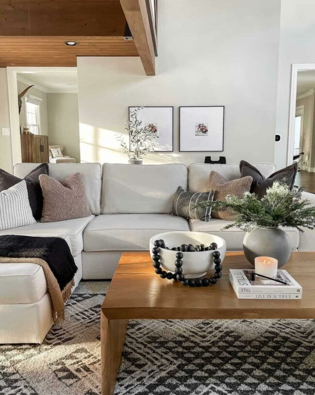 Natural wood elements anchor the scene, with a beautiful coffee table showcasing a woven tray holding books and a charming plant.