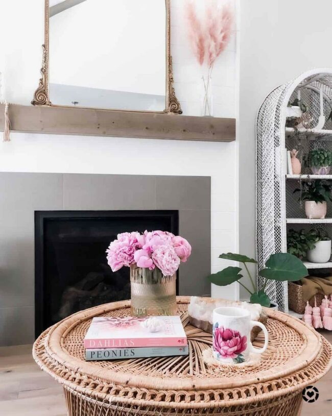 Blush pink peonies in a frosted vase radiate warmth, instantly drawing attention to this floral-themed coffee table arrangement.