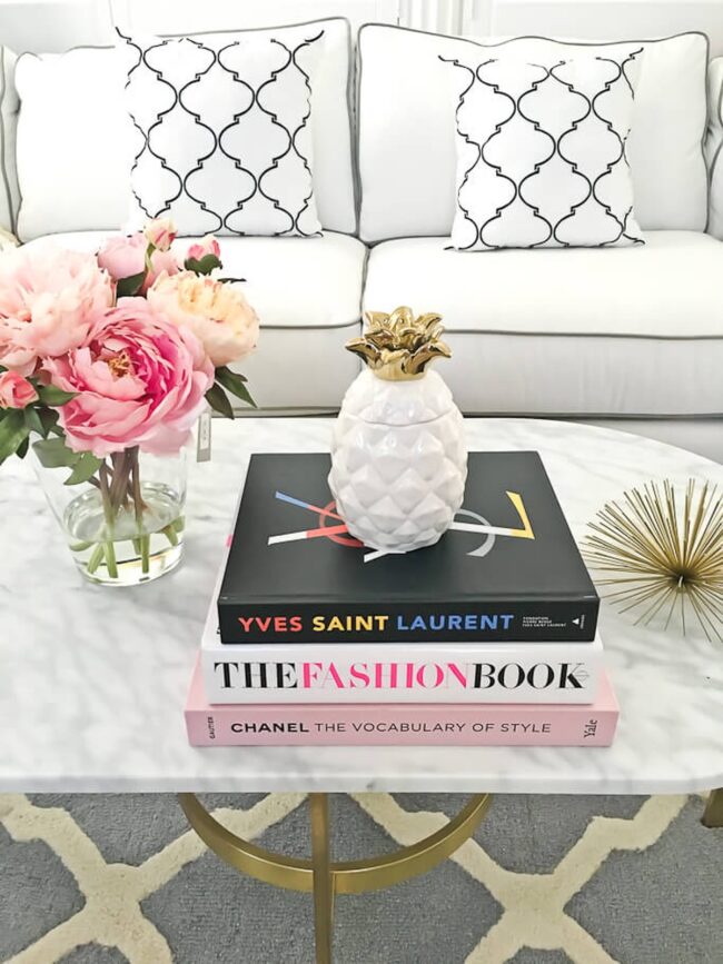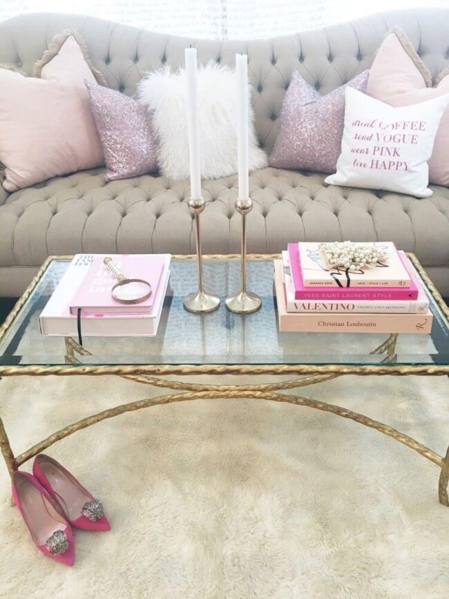 Charming pink books adorned with pearlescent accents rest casually nearby, bringing a playful touch to the sophisticated design.