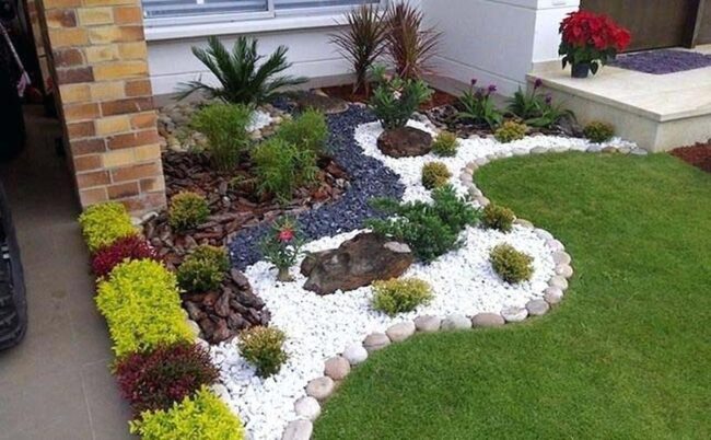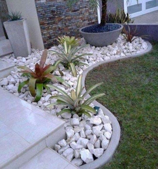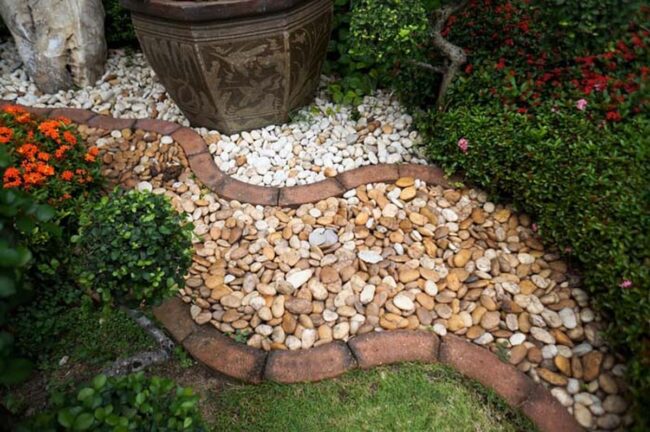Small patches of sandy soil become artistic landscapes when lined with cream-colored pebbles.