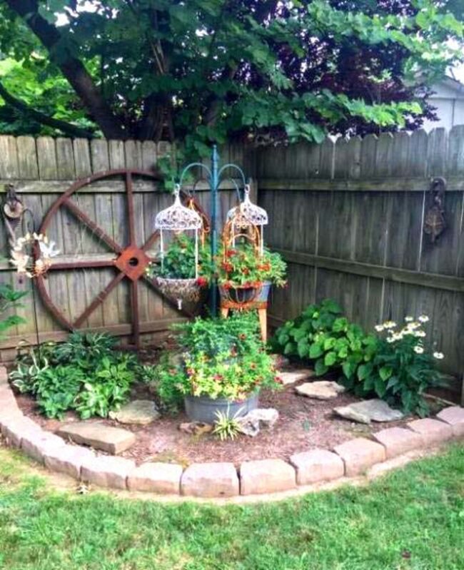 Mixed materials like weathered wood, rusted metal, and natural stone generate dynamic visual contrast throughout the garden space.