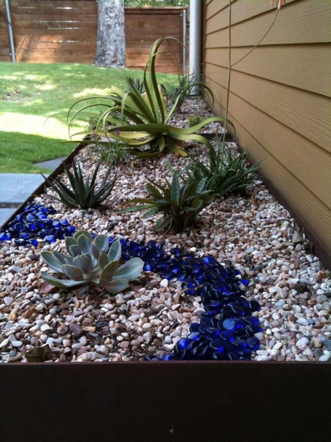 Mediterranean landscapers often use blue glass pebbles to create mesmerizing water-inspired garden designs that capture visual drama and natural elegance.