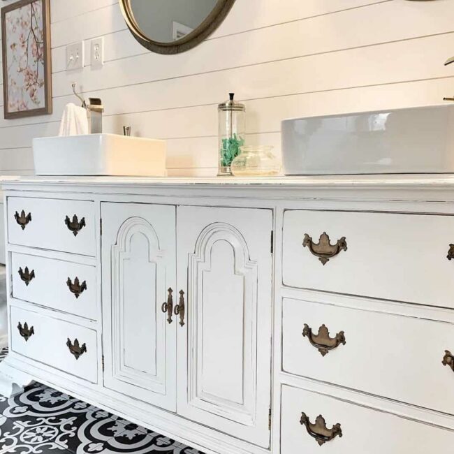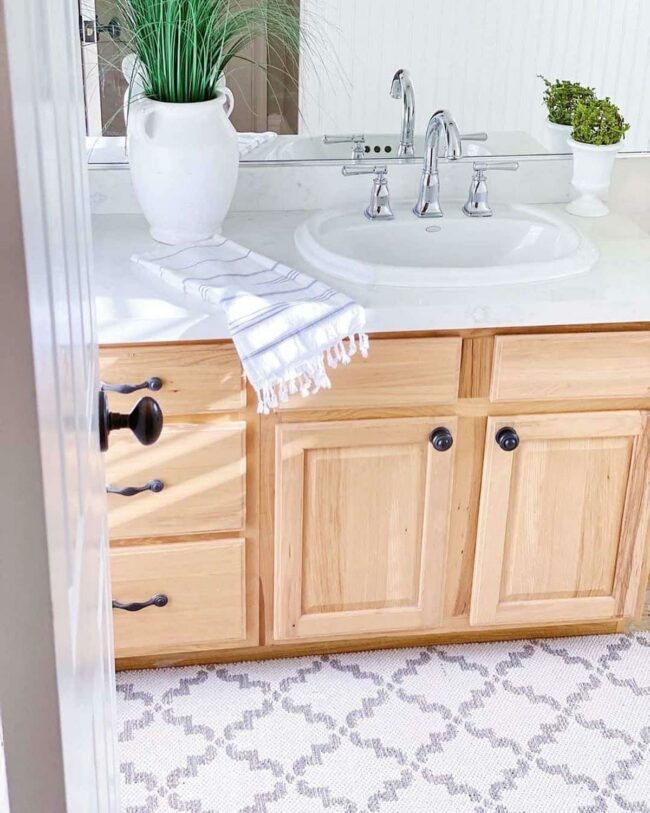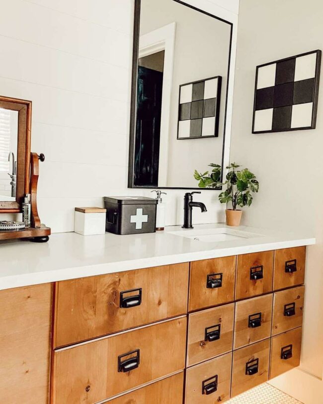 Wooden cabinets and drawers anchor this bathroom's design with rustic farmhouse warmth that feels both modern and inviting.