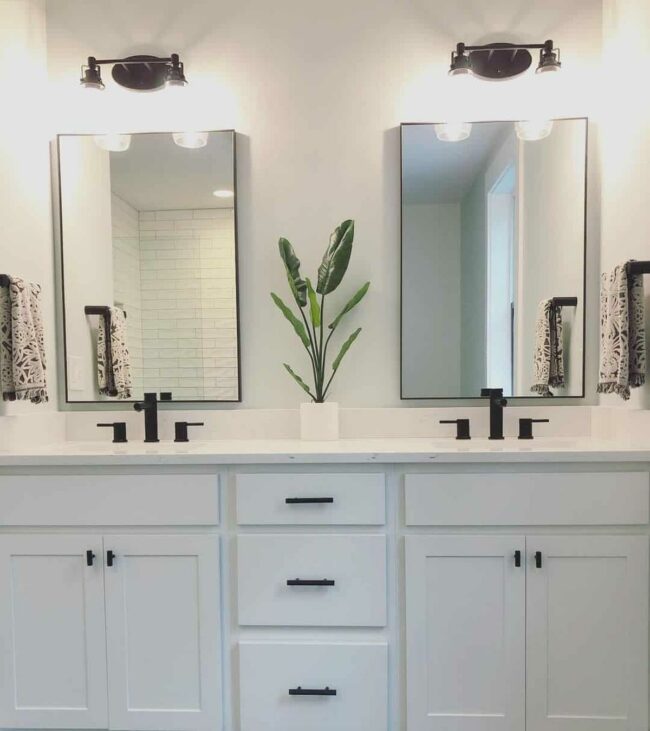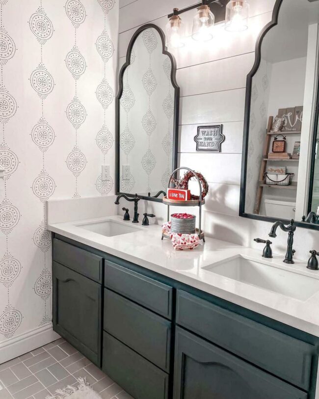 Black-Framed Mirrors Anchor Farmhouse Bathroom
