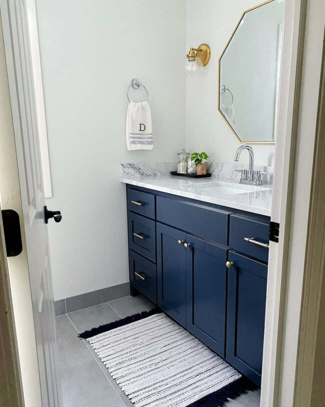 Marble countertops complement the navy shade, elevating the overall aesthetic with luxurious charm.