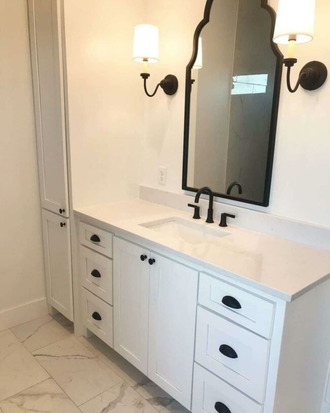 Black faucet details complement the crisp white sink, ensuring a cohesive look.