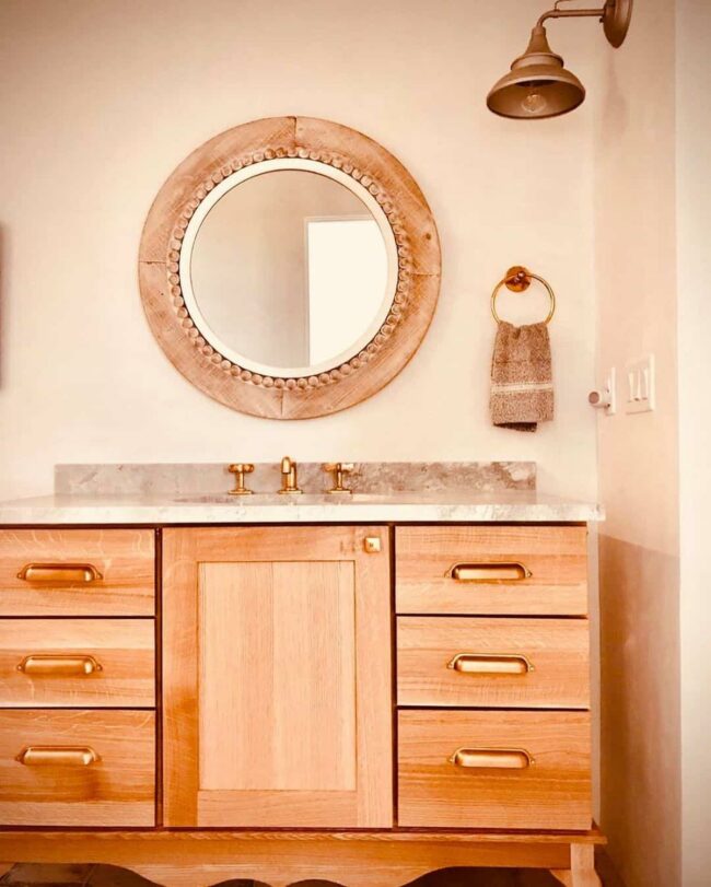 Round wood-framed mirrors reflect natural light and complete the aesthetic with understated grace.