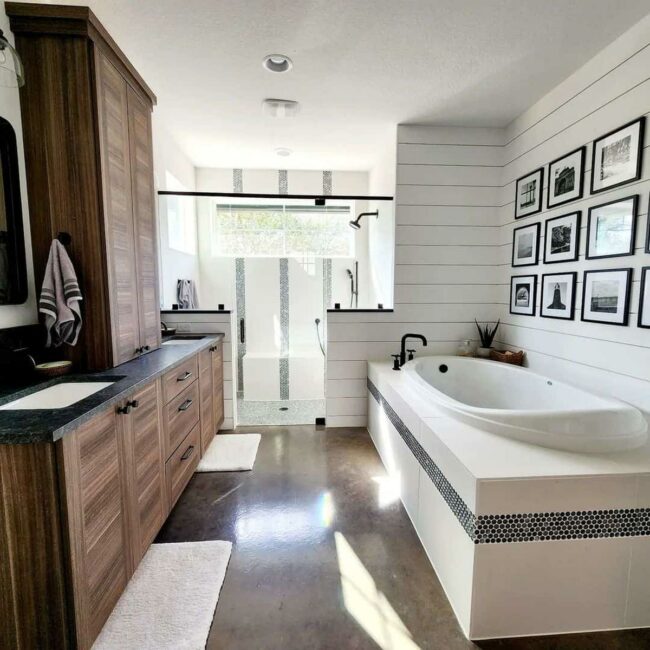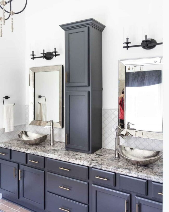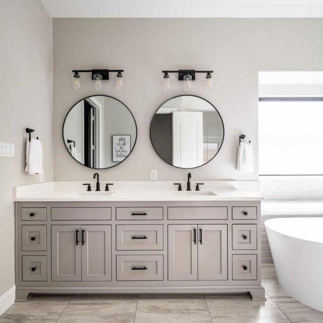 Modern farmhouse bathrooms radiate elegance with bold gray cabinets anchoring the entire space.