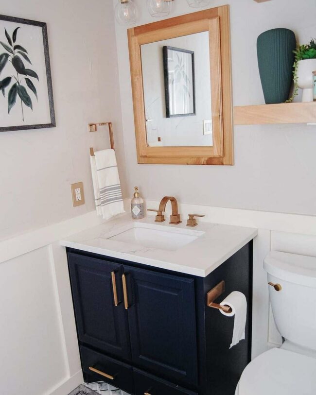 Navy blue cabinets make a dramatic statement in bathroom design, commanding attention with their rich, sophisticated color.