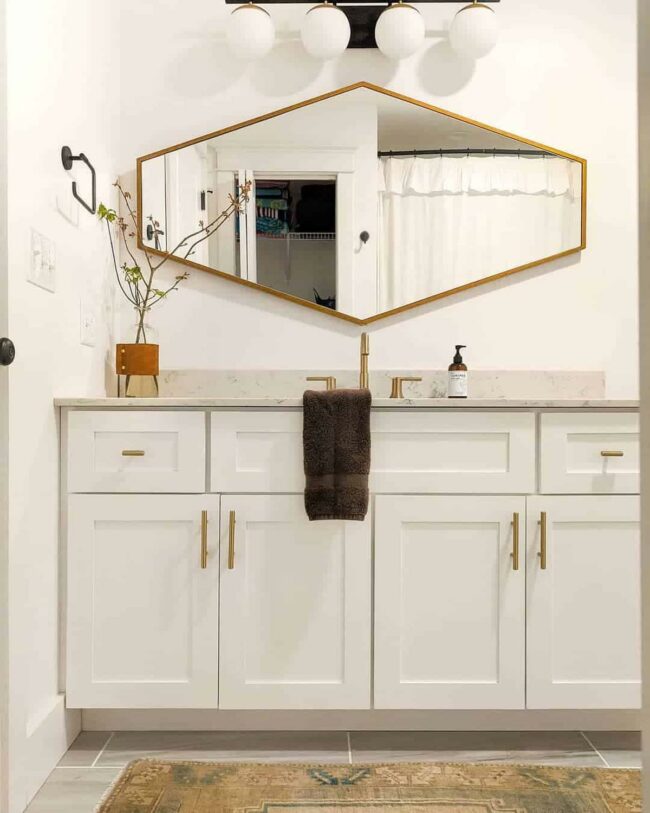 Gold-framed geometric mirrors spark immediate visual interest in this sophisticated bathroom design.