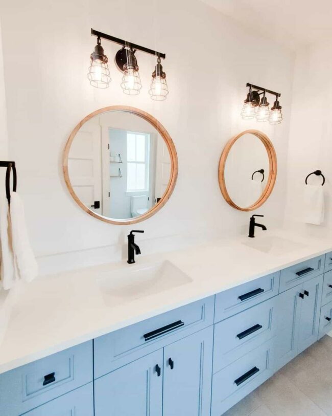 Round mirrors soften the bold cabinetry, creating a harmonious visual balance that feels both modern and timeless.