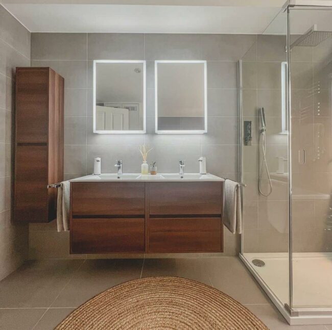 Sophisticated lighted mirrors reflect light and expand visual space effortlessly.