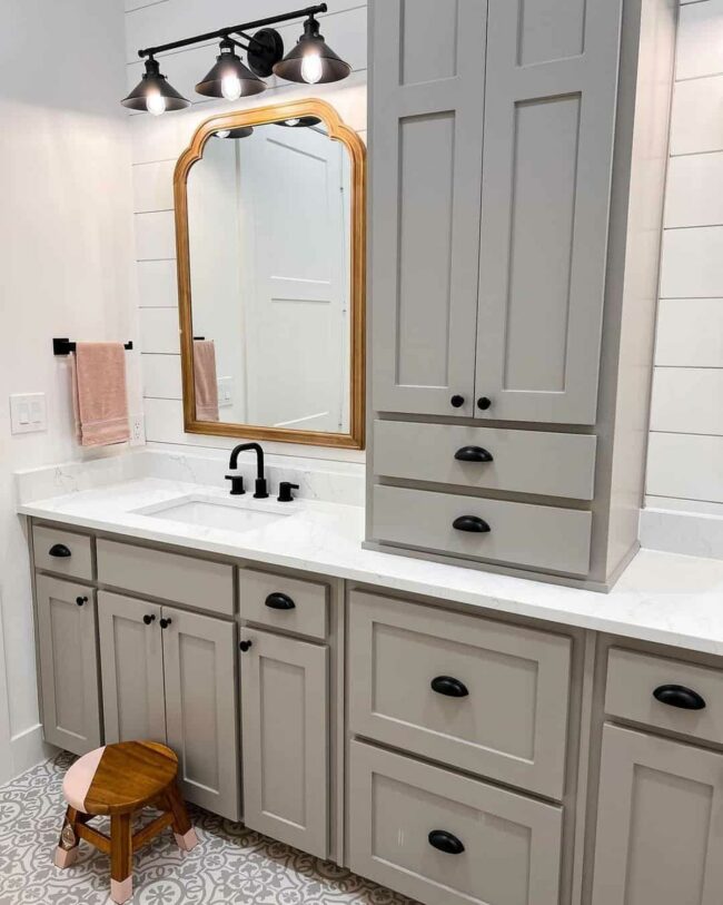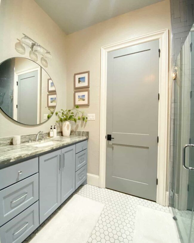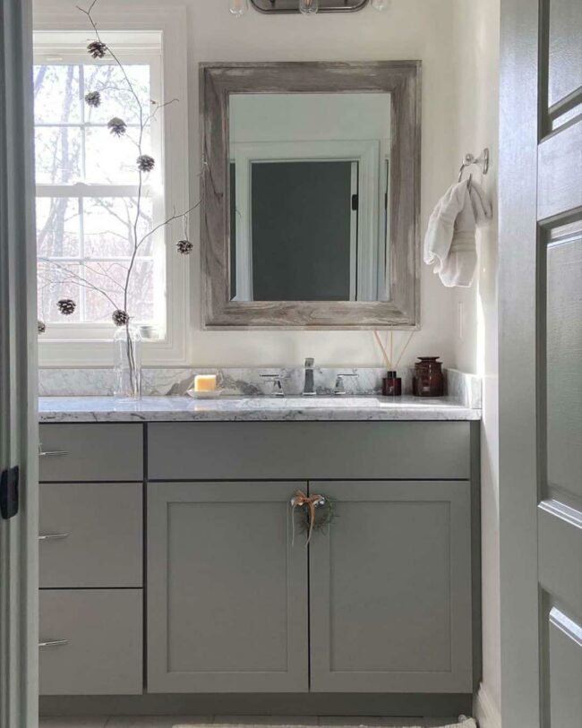 Gray cabinets anchor the cottage bathroom with modern sophistication, creating an instant visual impact.