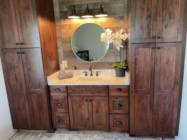Rustic wood cabinets anchor this farmhouse bathroom with incredible charm and character.