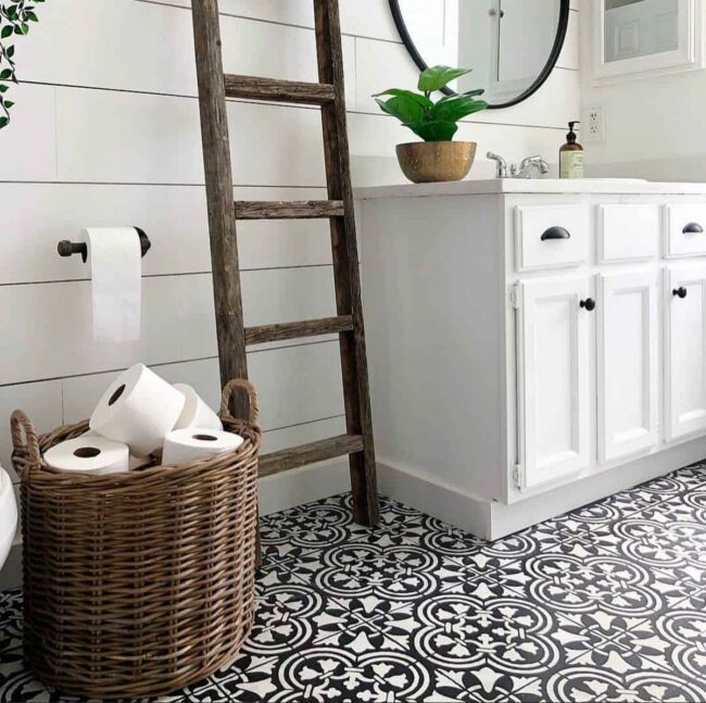 Striking black and white patterned tiles command attention the moment you enter this farmhouse bathroom.