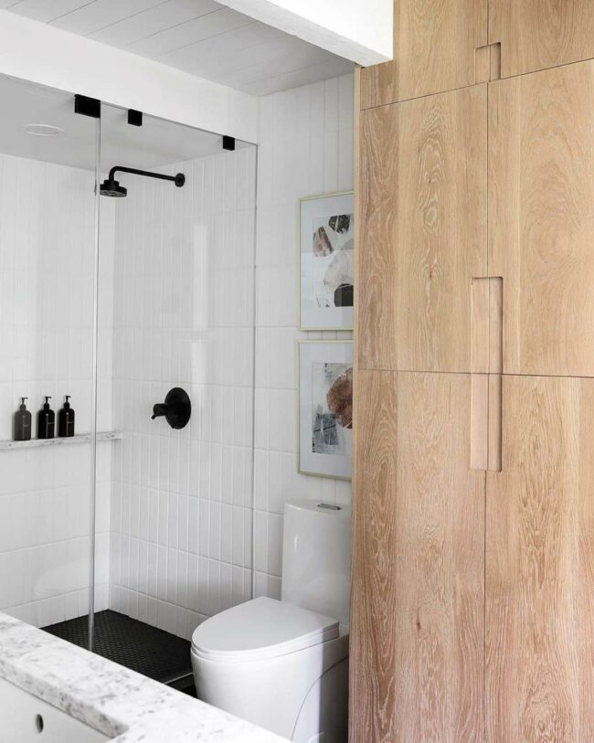 Wooden accents and minimalist details contribute to the bathroom's warm, inviting personality.