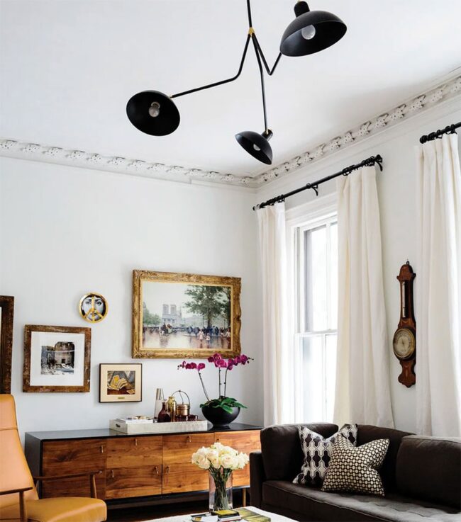 White molding adds sophisticated architectural detail, seamlessly connecting different design periods.