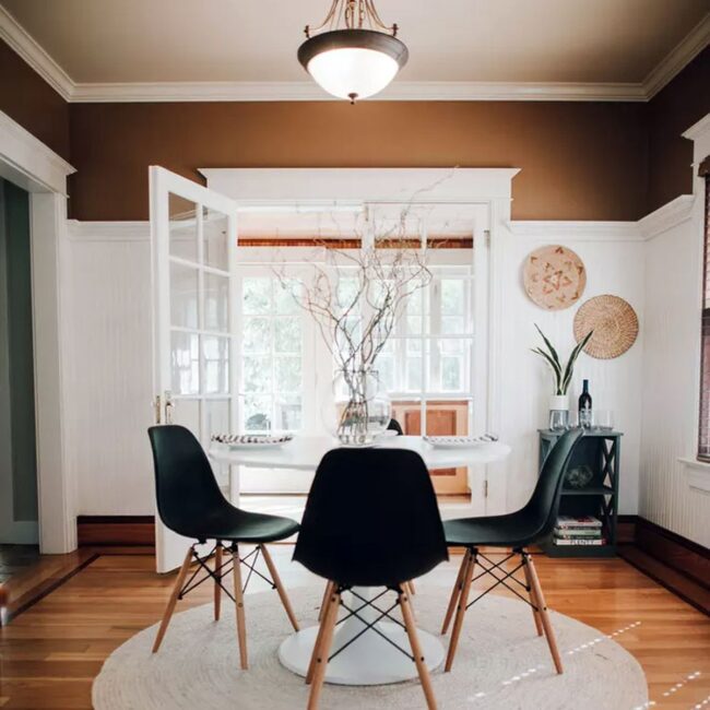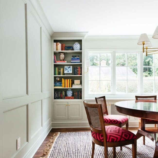 Wainscoting elevates this Craftsman-style home with extraordinary design prowess, extending dramatically along two-thirds of the wall instead of standard proportions.