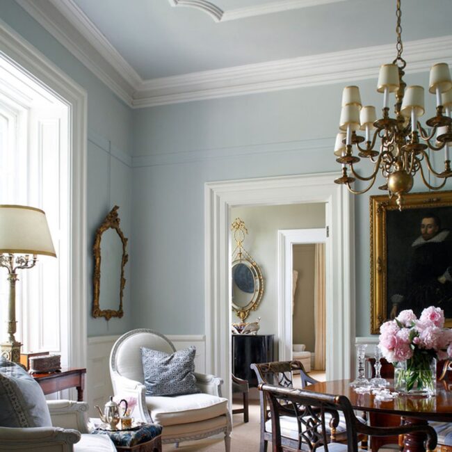 Elegant crown molding complements the higher wall treatment, enhancing the room's architectural character.