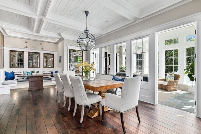 Rustic charm shines in this Southern-style dining room, where wood plank ceilings with recessed beams create a stunning basket-weave pattern that captures pure elegance.