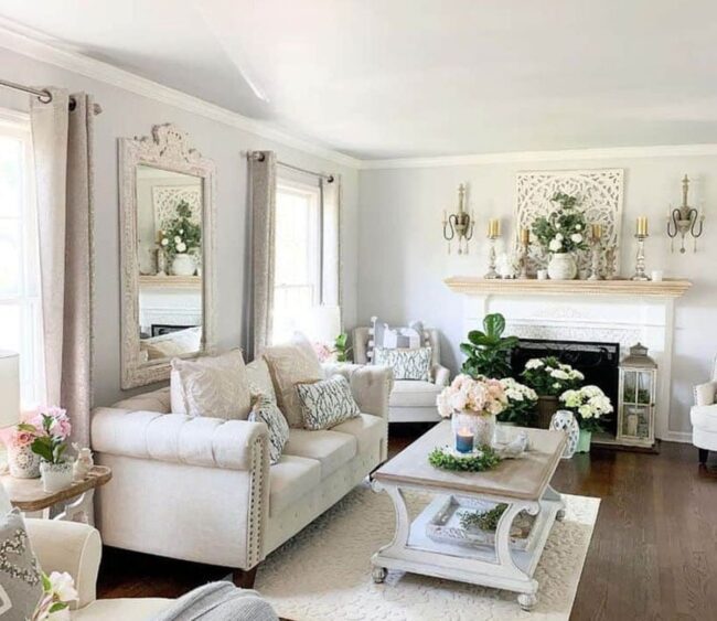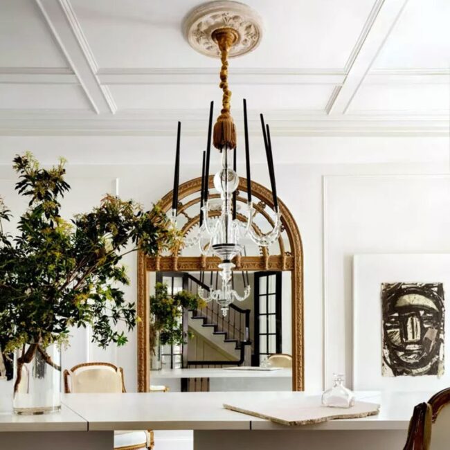 Traditional architectural elements provide a strong foundation for the room's glamorous aesthetic.