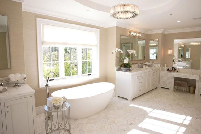 Crown molding with Federal-style elegance creates a stunning focal point in this luxurious bathroom sanctuary.