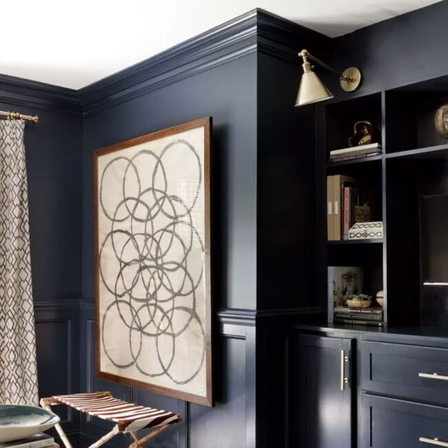 Navy blue walls paired with matching trim boldly redefine Colonial-style crown molding, creating a powerful design statement that challenges traditional decorating norms.