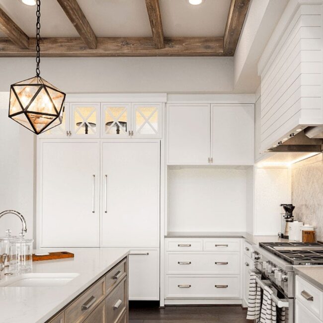 Farmhouse design reaches new heights in this kitchen masterpiece, where wood beams dramatically frame the space and create an instant wow factor.