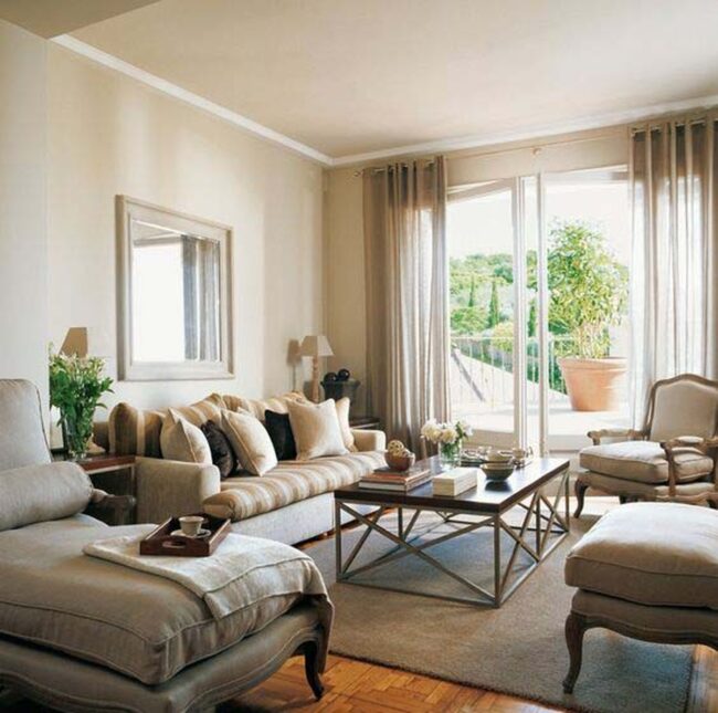 Large mirrors in coordinated frames dramatically enlarge compact rooms, creating an illusive sense of expansiveness.