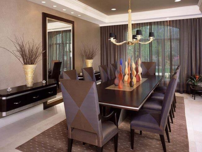Large rectangular mirrors strategically placed above or opposite dining tables instantly expand perceived space while reflecting ambient illumination.