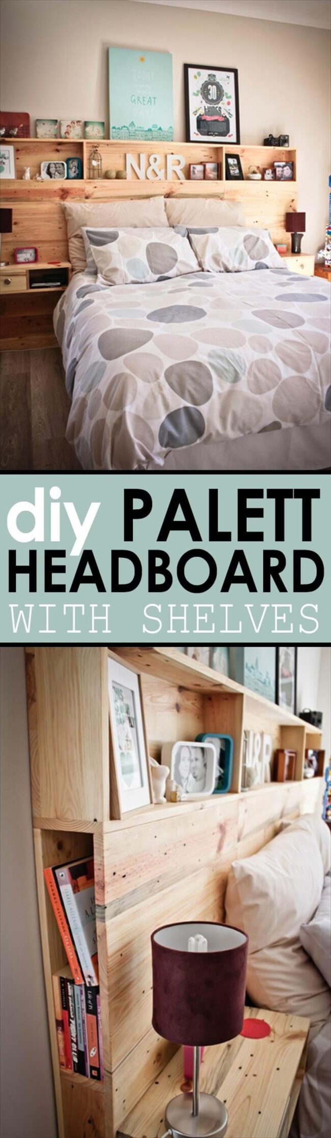Handy shelves nestled within the pallet frame provide perfect spots for displaying favorite books, cherished photos, or decorative items.