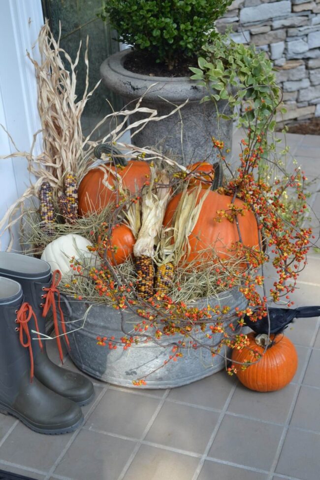 Fall decor bursts with rustic charm when pumpkins and corn nestle inside a galvanized metal tub.