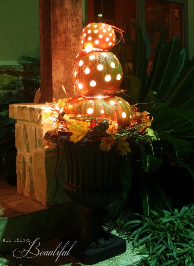 Delicate cutouts on stacked faux pumpkins create an enchanting visual display when lit from within.