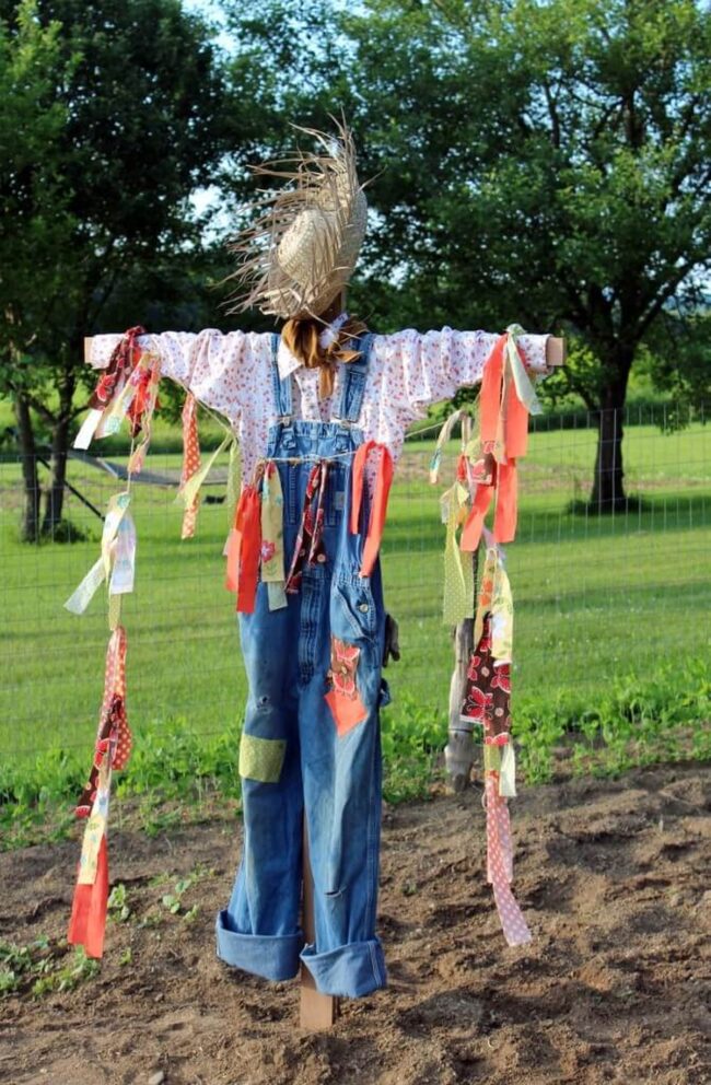 Carefully positioned straw-stuffed figures wear quirky outfits and weathered hats, adding personality to the rustic scene.