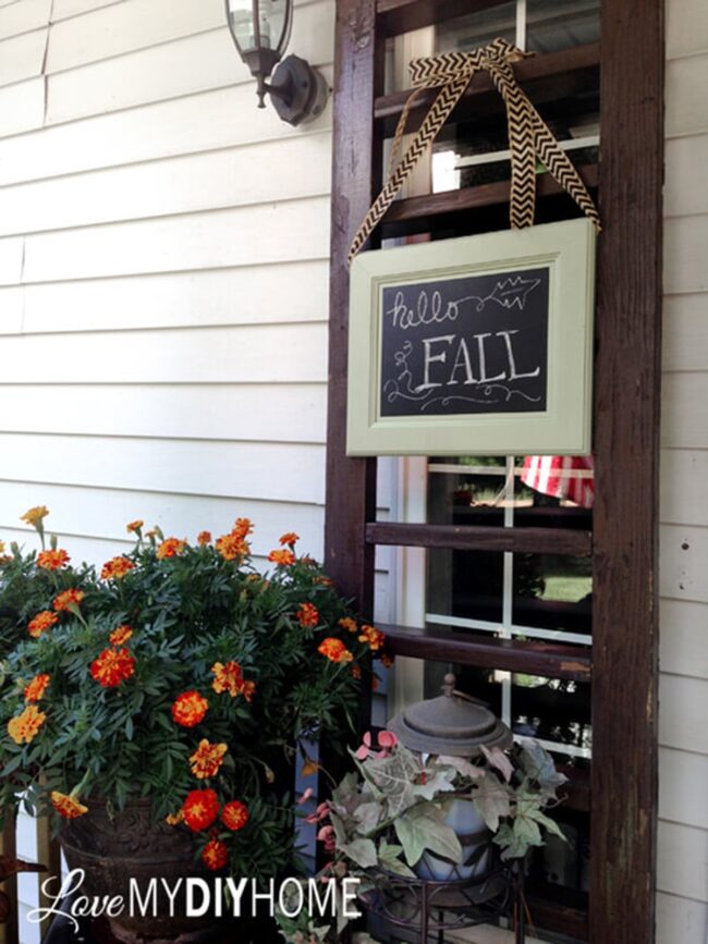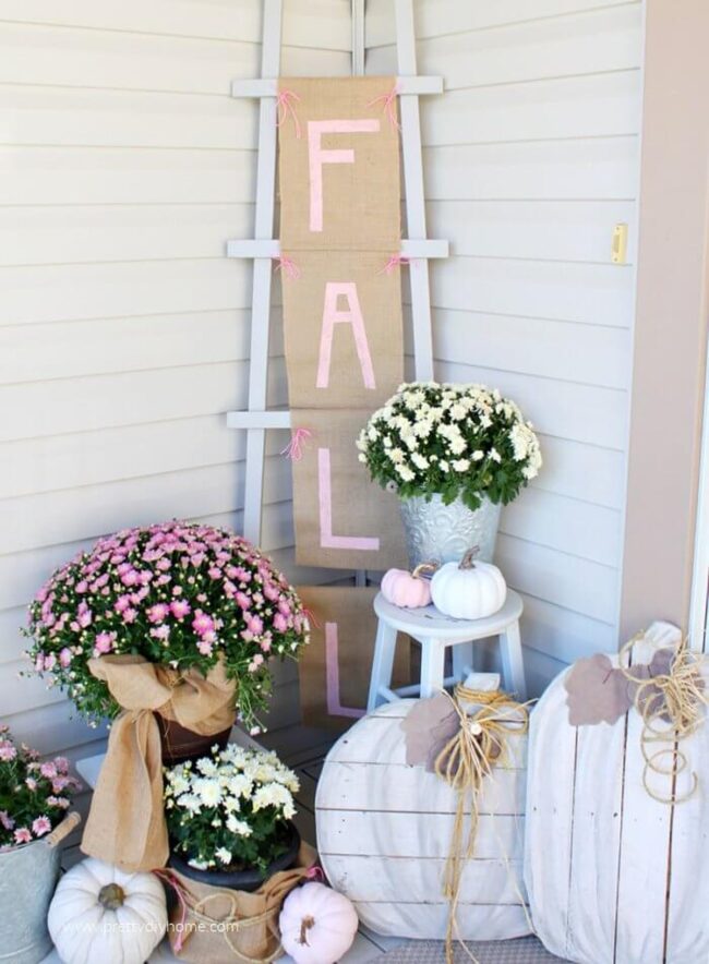 Fall porch decor reaches new heights with a pink ladder banner that breaks traditional autumn color rules.