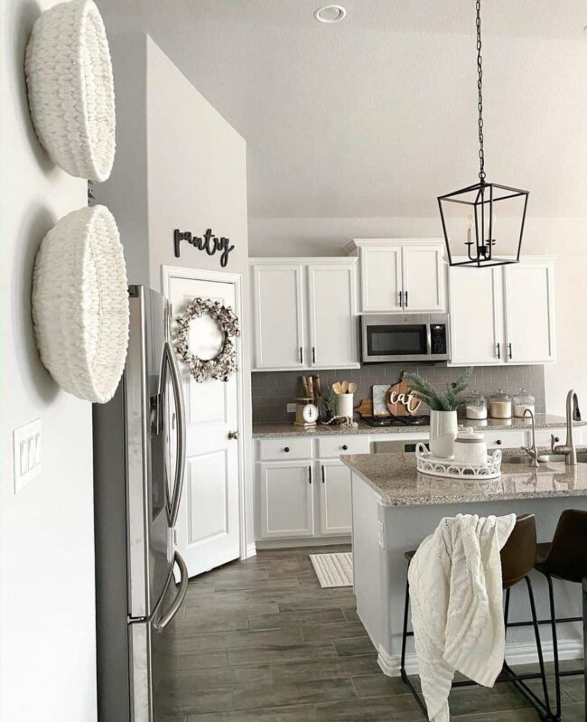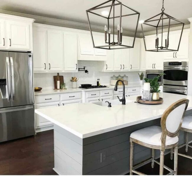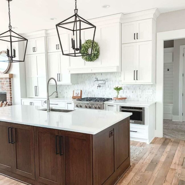 Rustic farmhouse kitchens radiate warmth and style with bold black pendant lights hovering above crisp white countertops.