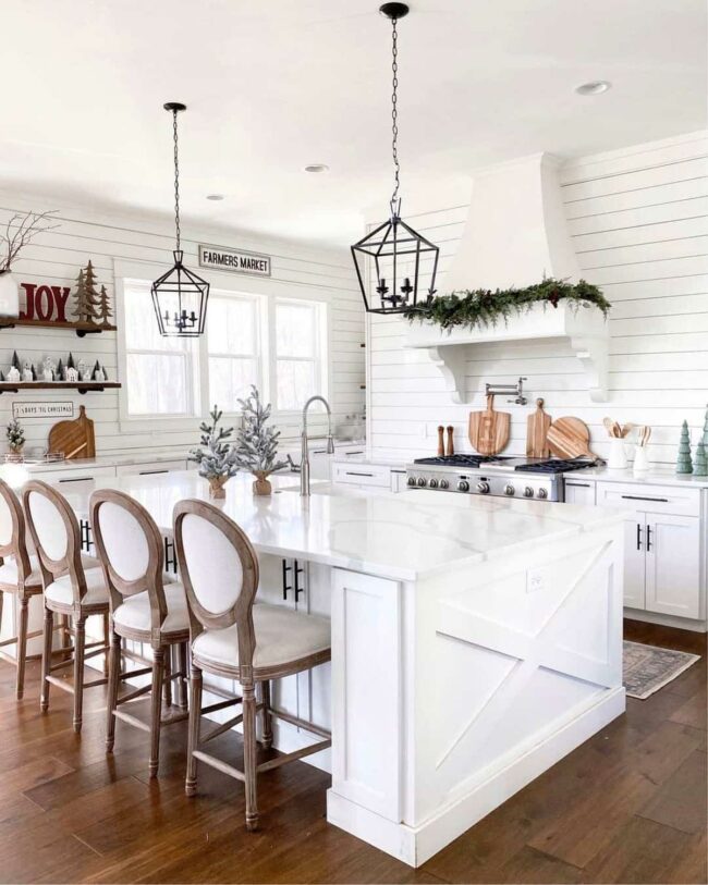 White shiplap cabinets and an island create a pristine kitchen sanctuary that immediately catches your eye.