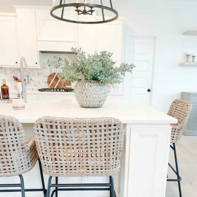 Rattan bar stools add natural texture that softens the modern aesthetic, making the area feel approachable and comfortable.