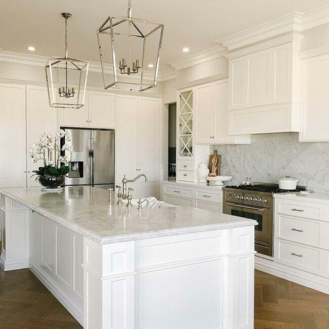 Polished nickel lanterns float elegantly above gray marble countertops, radiating a warm, luxurious atmosphere in this kitchen sanctuary.